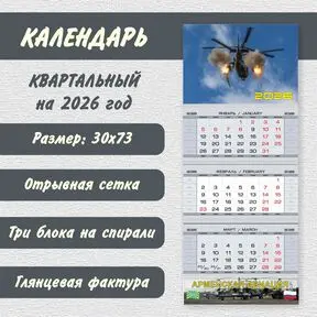 Квартальный календарь «Армейская Авиация» - состоит из трёх календарных блоков в отдельности. В наличии передвижной курсор для указания даты. Квартальный календарь - хороший и полезный подарок родным и близким, коллегам и партнерам. Заказывайте календарь заранее!